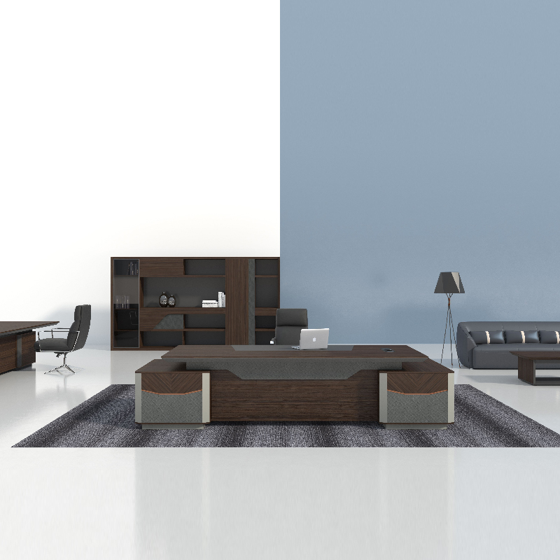 1、基材:符合E0級(jí)標(biāo)準(zhǔn)的MFC板; 2、飾面:采用三聚氰胺飾面紙; 3、五金:采用國(guó)內(nèi)優(yōu)質(zhì)五金配件; 4、臺(tái)面60mm厚,采用雙色設(shè)計(jì),45度油漆封邊,臺(tái)面工作區(qū)域采用捫皮工藝; 5、臺(tái)面配高品質(zhì)電源(無(wú)線充電,4個(gè)五孔電源插座,內(nèi)含過(guò)線孔); 6、副柜配置高品質(zhì)機(jī)械密碼鎖,配備兩抽屜和兩掩門(mén); 7、副柜前面采用斜紋拼花設(shè)計(jì),部分采用編織皮紋裝飾設(shè)計(jì); 備注:高管臺(tái)可左右互換